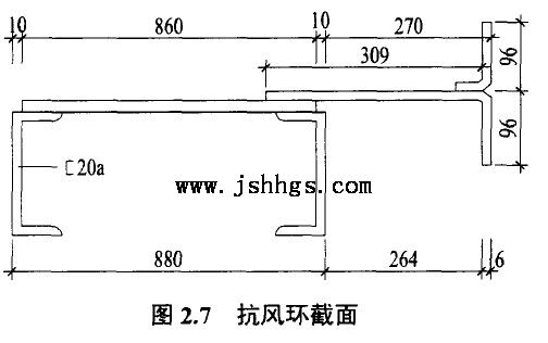 本文建立有限元模型时,参照了宝山公司己建成的12万材形式和构件尺寸,该气柜结构示意图如图1.3所示"柜体为正20曼型煤气柜的结构边形,由20根立柱!6层抗风环和相当数目的L型钢焊接而成,其主要外形尺寸为:煤气柜总高度93.78Om,侧板高86.142m,活塞最大行程77.580m,抗风环距离地面的高度依次为:17.00m!32.39m!47.78m!63.17m!78.56m!86.14m"侧板采用7m系列L型钢,立柱和抗风环的截面尺寸分别如图2.1和图2.7所示"立柱截面较小而又是主要承载构件,因此选用Q345钢,其余型钢如侧板!抗风环和柜顶析架等选用Q235钢。