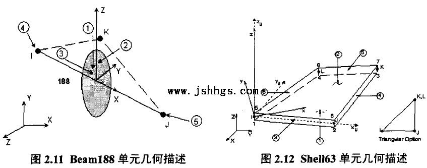 Beam188单元是基于Timoshenk"梁理论!并考虑剪切变形的三维线性有限应变二节点梁单元,如图2.11所示,每个节点有6个或7个(考虑壳曲)自由度,非常适合线性!大角度转动和非线性大应变问题"用SECTYPE!SECDATA!SECWRJTE等命令来定义梁的横截面,其中SECTYPE命令可定义截面形状为矩形!工字型!T