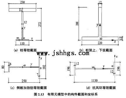 型或任意截面等"根据气柜构件的实际截面情况,立柱!加劲肋!抗风环!柜顶环梁和析架上下弦截面均用该单元拟"柜顶环梁用矩形截面,截面尺寸为300~x400~,析架上!下弦用T型截面,截面尺寸如图2.13(b)所示"立柱!加劲肋和抗风环都是组合截面(图2.1!2.6!2.7所示),考虑到建模方便,按截面面积!抗弯刚度和截面抵抗矩相等的原则,将组合截面用工字型截面等效,相应截面如图2.13所示.