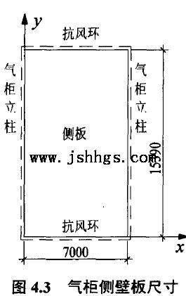 传递至立柱的风载,与相邻板块传来的风荷载合成以后,一部分通过立柱传至立柱与抗风环的交界处,另一部分通过侧板的环向弯曲及立柱的扭转变形,在环向内自相平衡,即后一部分不传至基础也不传至柜顶。
