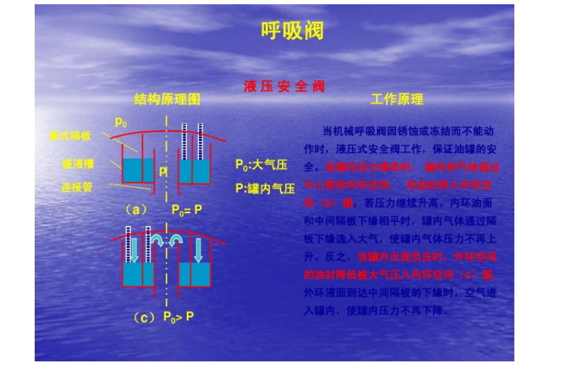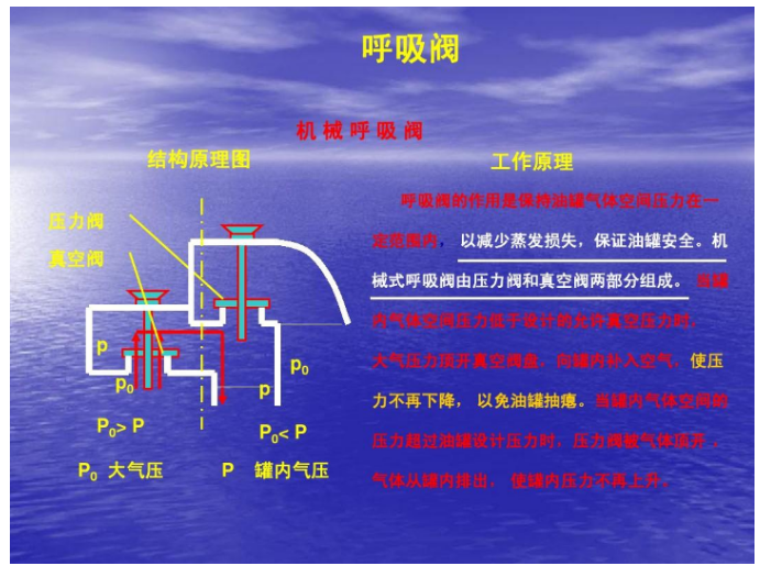 呼吸阀是保护储罐安全的重要附件,安装于灌顶,用于自动控制储罐内外气体通道的启闭,维持储罐的压力平衡,对储罐的超压或超真空起保护作用,又可以在一定范围内降低储罐内介质的蒸发损失。