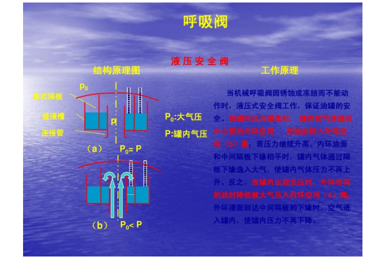 呼吸阀是利用阀盘(有时阀盘上加重块)的重量,来控制罐内的呼气压力和吸入的真空度。当罐内气体的压力超过油罐的允许压力值时,压力阀即被顶开,混合气从罐内逸出(呼出),使罐内的压力不再增高。当罐内气体的真空度超过储罐的允许真空度时,真空阀即被顶开,吸入空气(吸入)维持储罐压力平衡。压力在一定范围内,储罐不呼吸,所以呼吸阀在一定程度上减少了介质的蒸发损耗。呼吸阀控制的压力和真空度的数值应根据储罐结构本身的允许值来决定。选择呼吸阀型号时,要根据介质收发作业时的最大排量来确定。呼吸阀的直径大于250mm时,可选用两个不超过250mm的呼吸阀。