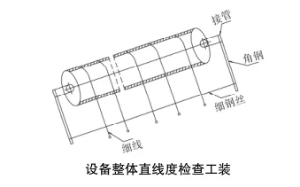 所述塔器整体直线度检查工装,其结构包括:一对角钢、一根细钢丝、数根细线加吊坠;将等长角钢焊接在上下封头中心接管上,细钢丝固定在两根角钢同一位置。一对角钢长度必须一样并且角钢边缘在接管中心上,细钢丝在角钢上固定的位置也一样并且绷紧,将数根细线从筒体同一方位自然垂下,检查细线与细钢丝间的距离来判别直线度是否合理,如下图所示。