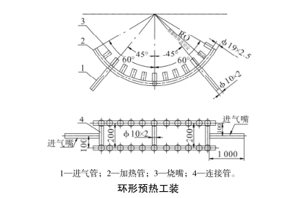 压力容器预热工装包括:进气管、加热管、烧嘴、连接管、支架。上述部件焊接连接,根据所预热部位高度对支架进行调整,使用时,首先将加热管根据筒体直径大小进行炜弯,加热管两端封闭,在连接烧嘴的部位上钻孔用于给烧嘴输送天然气,烧嘴与筒体外表面距离 20~30 mm,整个工装根据焊缝宽度和筒体直径确定预热范围及工装支架的高度,确定好焊缝预热范围进而确定连接管长度,进气管与连接管相连进气进而将天然气传递到加热管,为了增大预热范围及加热速度,在烧嘴中部两侧开孔,最后将所有部件焊接连接,将整个工装焊接固定在焊缝预热处正下方,所述工装根据预热部位可进行改进使用,对于接管预热将加热管连成整圈,提高预热效率。如若工作量较大,可一次制造多个加热管同时使用,以提高生产效率。