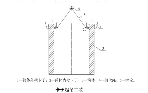 通过天车连接滑轮和钢丝绳,将起吊力通过滑轮和钢丝绳传递到筒体内壁卡子上增大卡子对筒体的卡紧力。所述模具配合使用,将吊具卡在筒体壁上进行吊装和翻转。