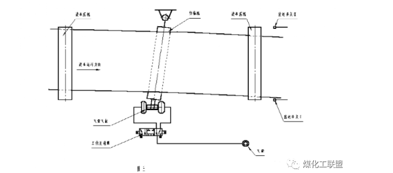 ③ 如图三示:当滤布向接近开关Ⅱ方向跑偏时,滤布触动拨杆使感应板接近开关Ⅱ,当达到感应距离时,接近开关Ⅱ输出信号,使二位五通阀Ⅱ通电换向,二位五通阀ⅡB输出压缩空气,A排空;气缸Ⅱ活塞杆伸出;此时纠偏辊如图示偏转一定角度,在图示纠偏辊作用下,滤布的跑偏迅速纠正,向接近开关Ⅰ方向移动;当到达中间位置时,接近开关Ⅱ感应信号消失,气缸Ⅱ又重新回到图一状态。