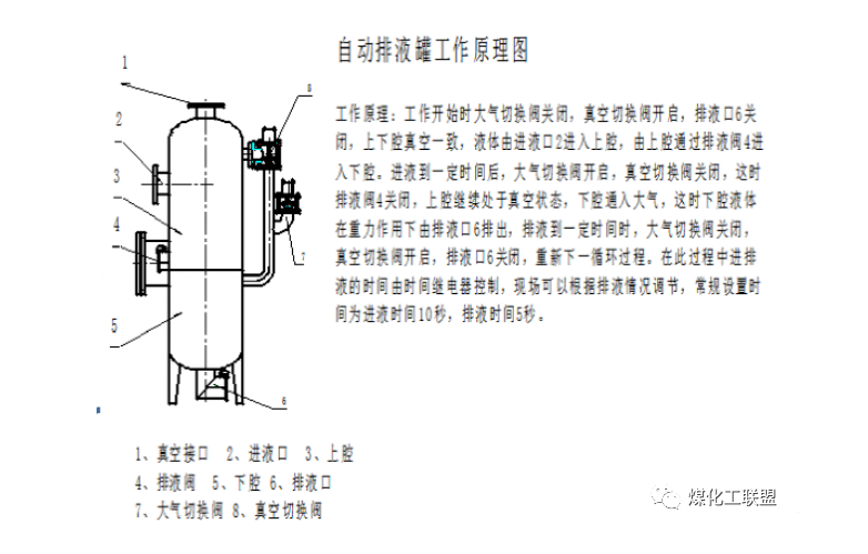 真空自动排液罐由一个分隔为上下两腔的筒体,封头,气液进出口,内外排液阀,大气切换阀和真空切换阀及液位计等组成。